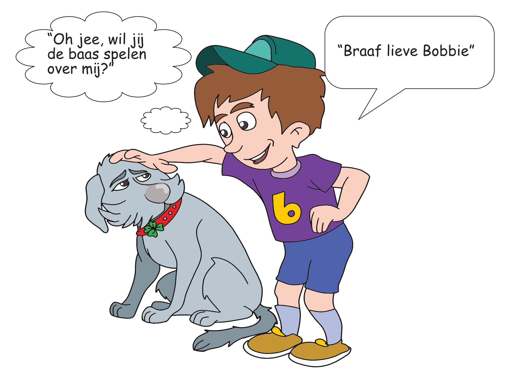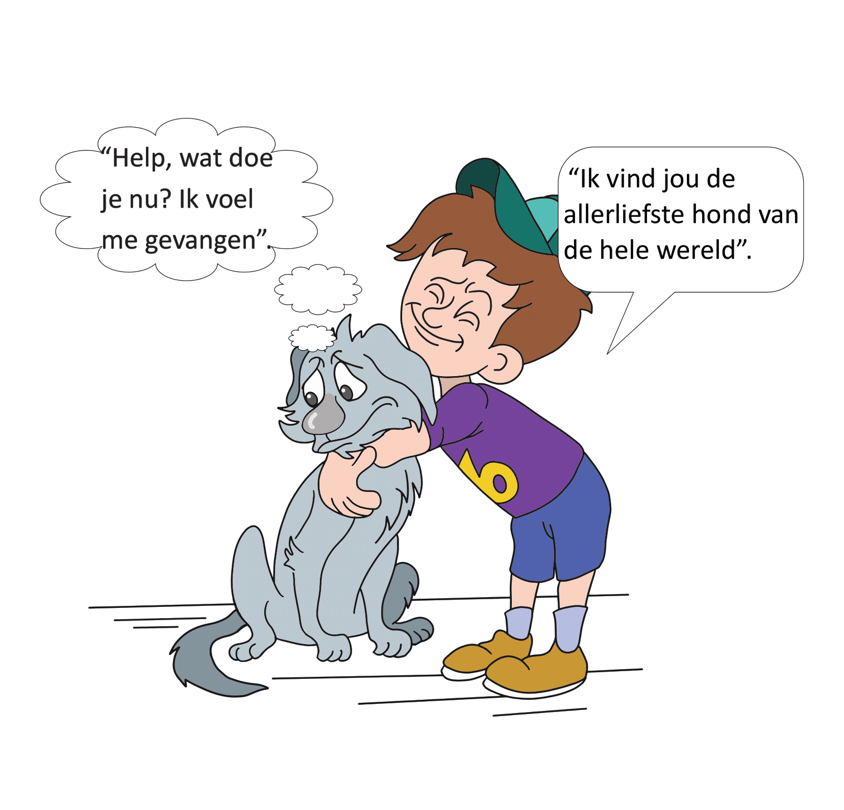 Op het linkerplaatje kun je zien dat Bobbie het niet fijn vindt om geknuffeld te worden. Een hond kan zich gevangen voelen als zij wordt geknuffeld. Op het rechterplaatje zie je dat Bobbie heel erg blij is. Bobbie vindt een aai veel fijner dan een knuffel!