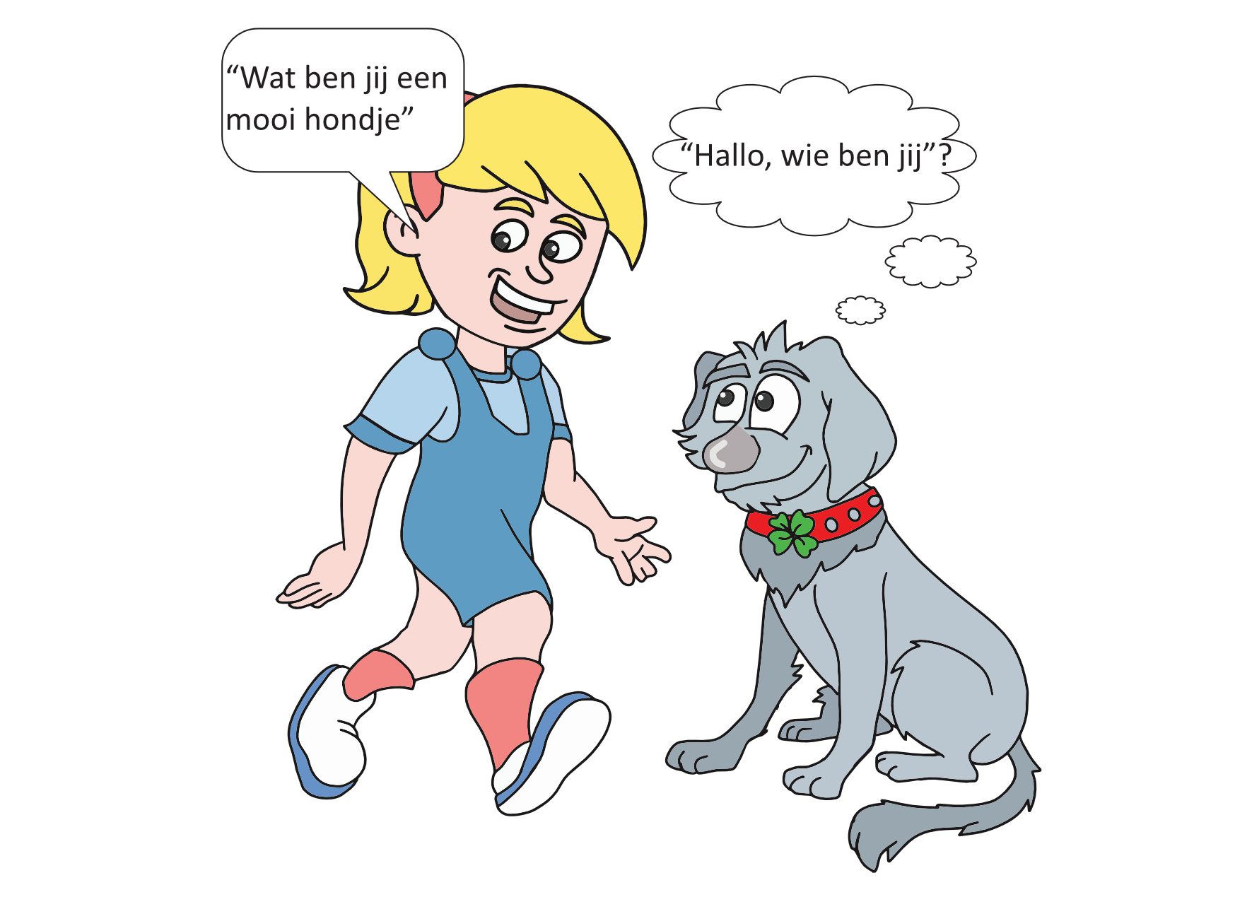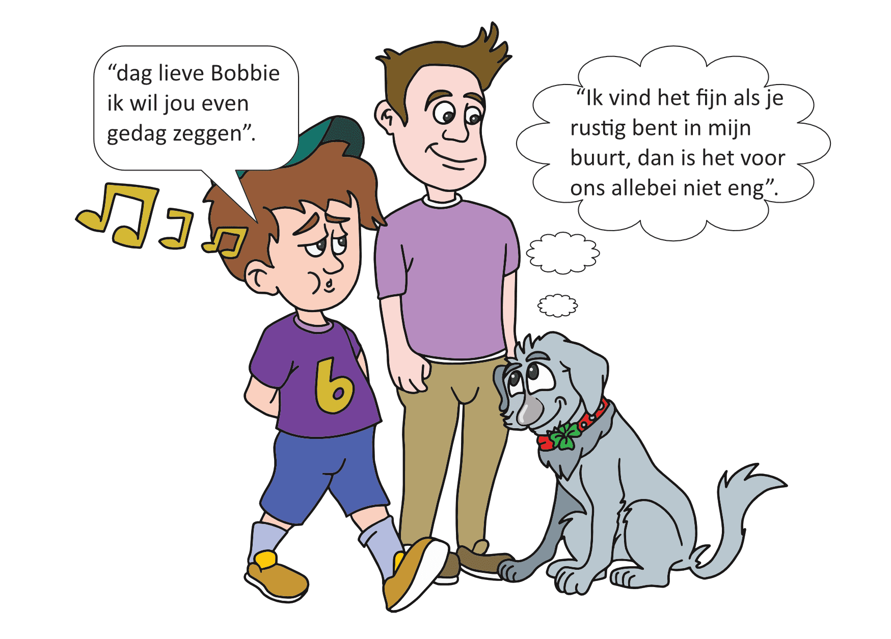 Op het linkerplaatje kun je zien dat Bobbie schrikt van het idee dat zij zomaar geaaid wordt. Het is belangrijk dat je eerst altijd het baasje vraagt of je de hond mag aaien. Laat de hond eerst even aan je hand snuffelen, op die manier kan de hond rustig aan je wennen en zie je gelijk of de hond geaaid wil worden of toch liever niet.