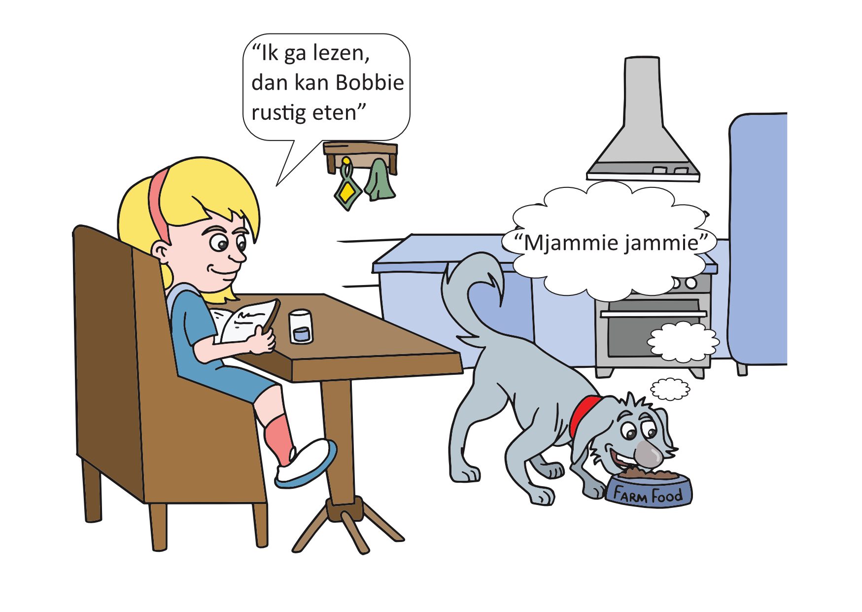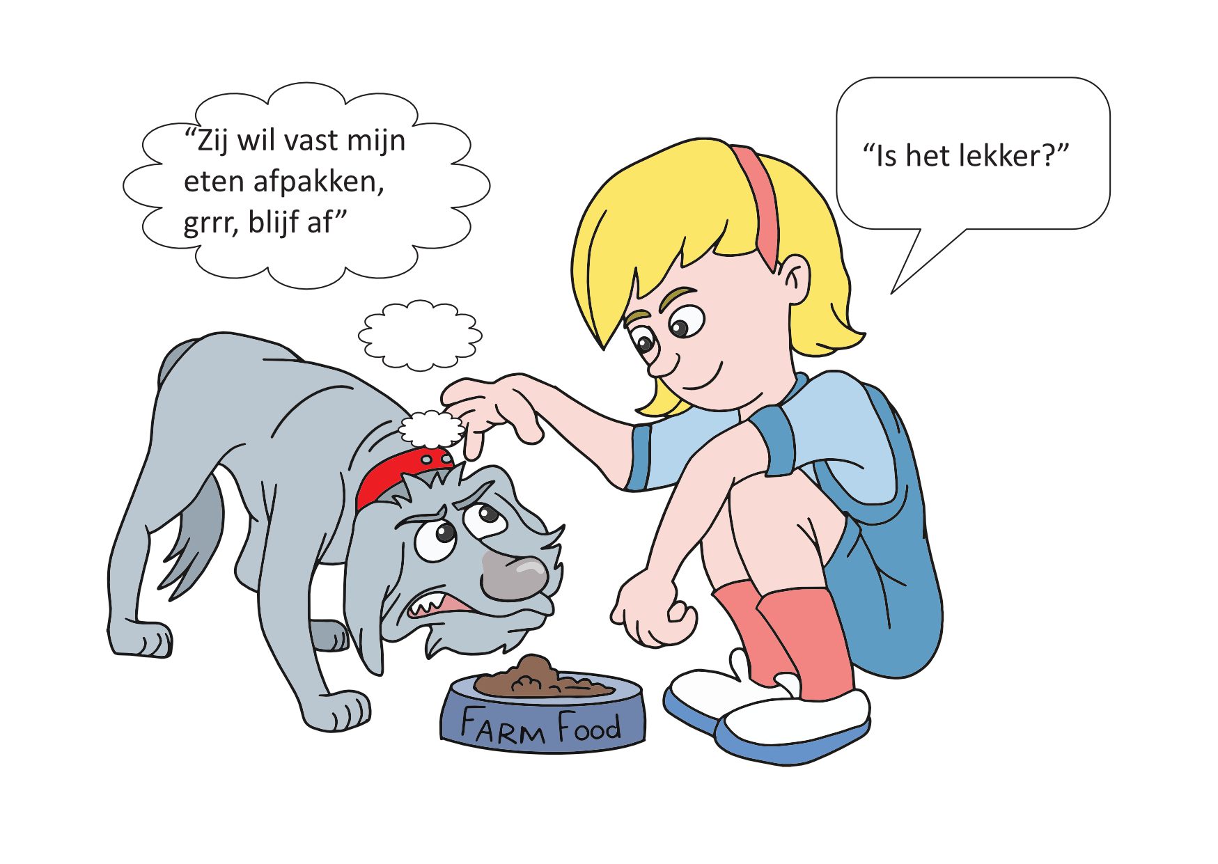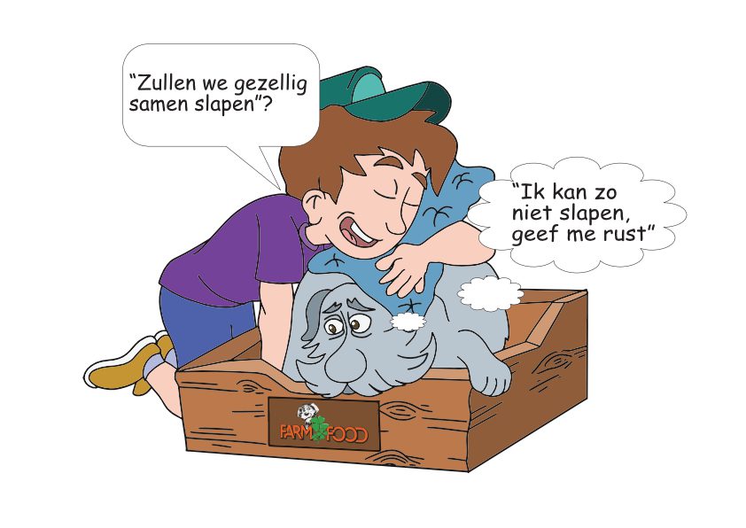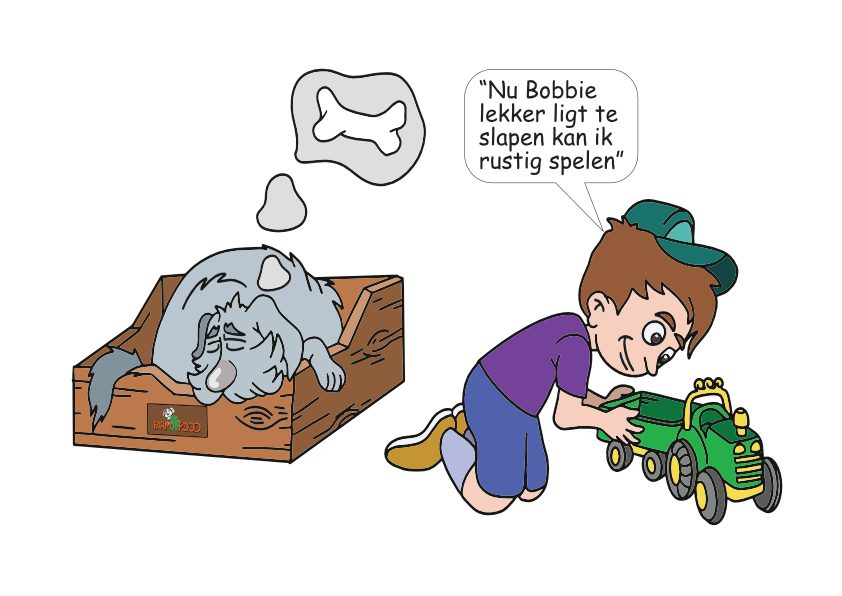 Op het linkerplaatje kun je zien dat Bobbie het niet fijn vindt als je dichtbij haar komt terwijl ze eet of slaapt. Bobbie vindt het fijner als je haar de ruimte geeft tijdens het eten en slapen, zodat jullie daarna weer kunnen spelen!