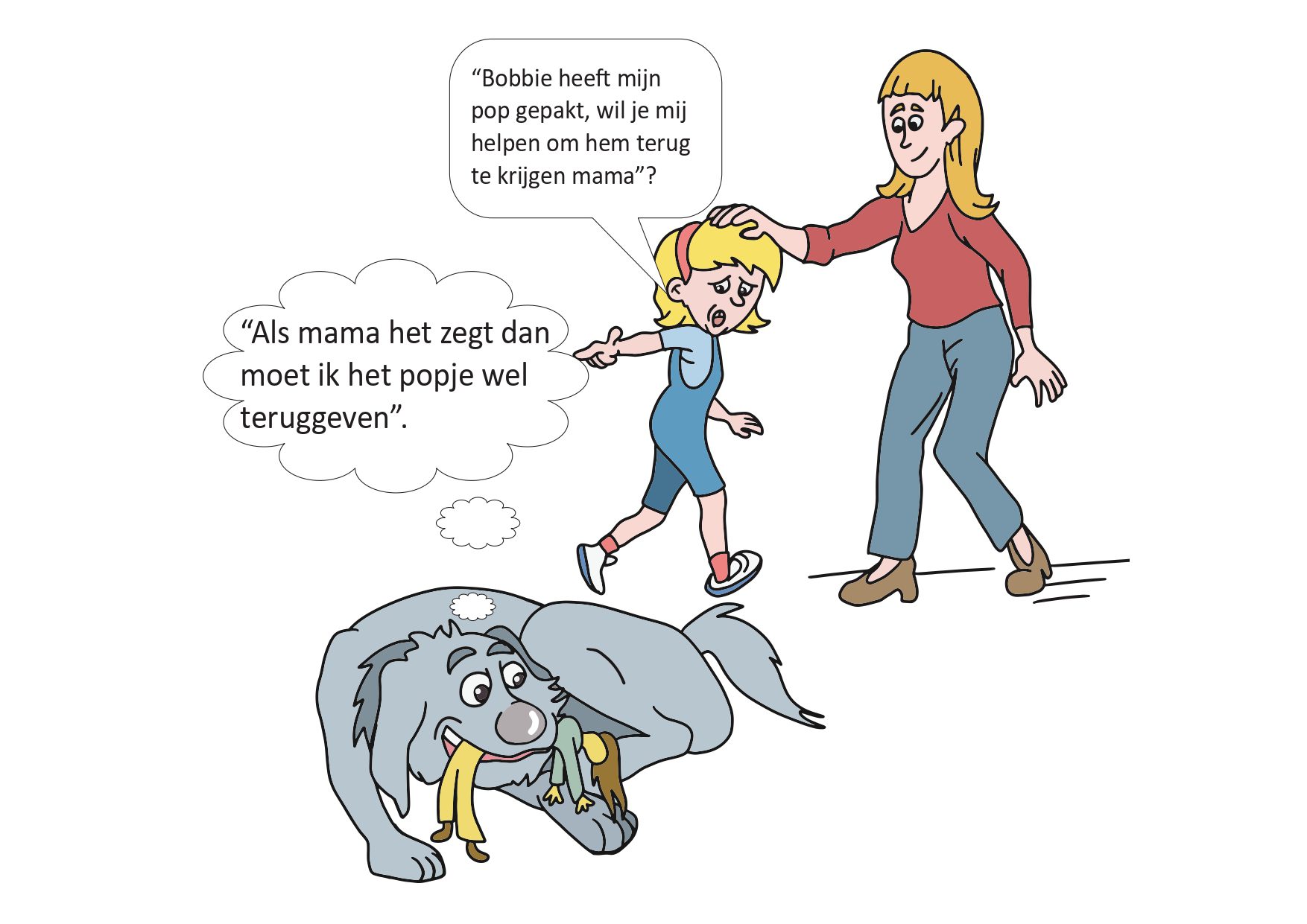 Op het linkerplaatje zie je dat Bobbie het popje heeft afgepakt en nu denkt dat die van haar is. Als je het popje dan probeert terug te pakken, kan Bobbie boos worden. Op het rechterplaatje zie je dat het meisje haar mama om hulp vraagt. Papa of mama zorgen er dan voor dat je het popje weer terugkrijgt.