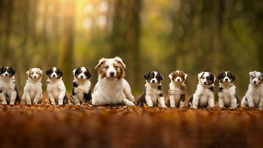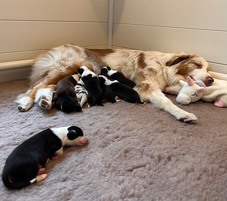 “Rond 14.00 uur zag ik de eerste weeën en heb ik mijn man geroepen. Even later keek Fien naar haar achterkant en om 14.05 uur werd de eerste pup geboren. Binnen anderhalf uur waren alle negen pups gezond ter wereld gekomen. Een mooier verjaardagscadeau had ik mij niet kunnen wensen. Fien was een fantastische moeder. Tijdens de bevalling, het schoonlikken van de pups, het doorbijten van de navelstrengen en haar alertheid op de kleinste noodkreetjes: alles ging instinctief goed”, vertelde Bianca.