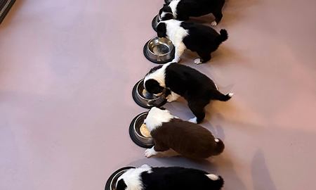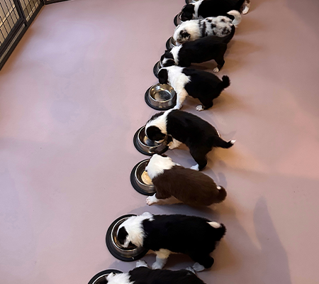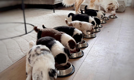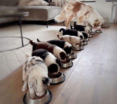 Tijdens het afspenen begonnen de pups met vers vlees van Farm Food. “Dat was meteen een groot succes”, vertelde Bianca. “Ze aten het met smaak en hun ontlasting was perfect: klein, stevig en goed hanteerbaar, ideaal bij een nest van maar liefst negen pups!” Hierna hebben ze geleidelijk de overstap gemaakt op geperste brokken. “Zeven pups deden het hier direct uitstekend op. Twee pups hadden iets meer tijd nodig en kregen daarom iets langer een combinatie van brokken en vers vlees. Ook deze twee ontwikkelden zich uitstekend en precies zoals ik hoopte”, vertelde Bianca. “Dankzij het advies en de voeding hebben we een prachtig, gezond nest kunnen grootbrengen. Voor de nieuwe baasjes betekent dit dat hun pup een stevige, stabiele basis meekrijgt.”