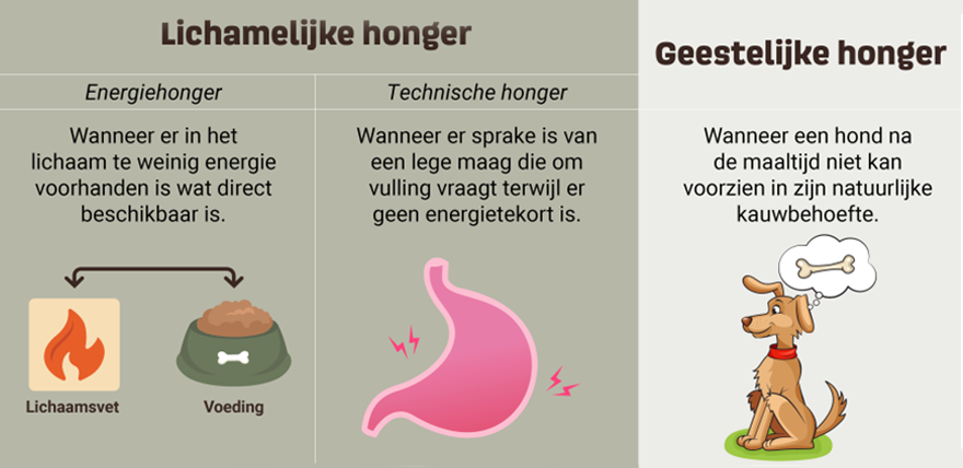 Wanneer een hond na de maaltijd niet kan voorzien in zijn natuurlijke kauwbehoefte, kan er dus geestelijke honger ontstaan. Als dit ontstaan is, dan zal je hond dit proberen te compenseren door op zoek te gaan naar “iets prettigs” door bijvoorbeeld te gaan schooien. Veel eigenaren vatten dit op alsof de hond nog niet genoeg gegeten heeft en dan zal dit kunnen resulteren in het krijgen van meer voeding of iets lekkers. Door het bevredigen van hun kauwbehoefte stillen ze dus eigenlijk hun geestelijke honger!